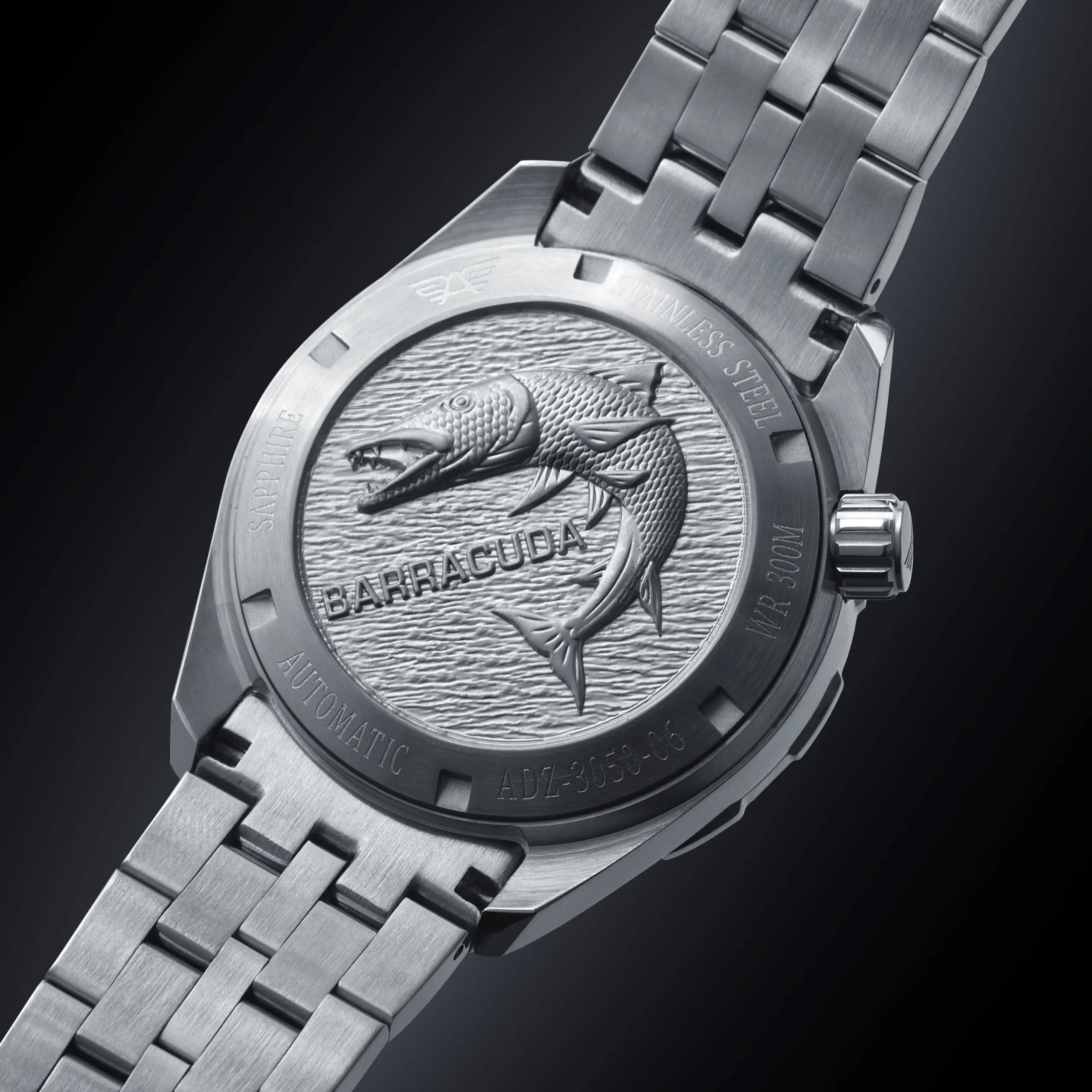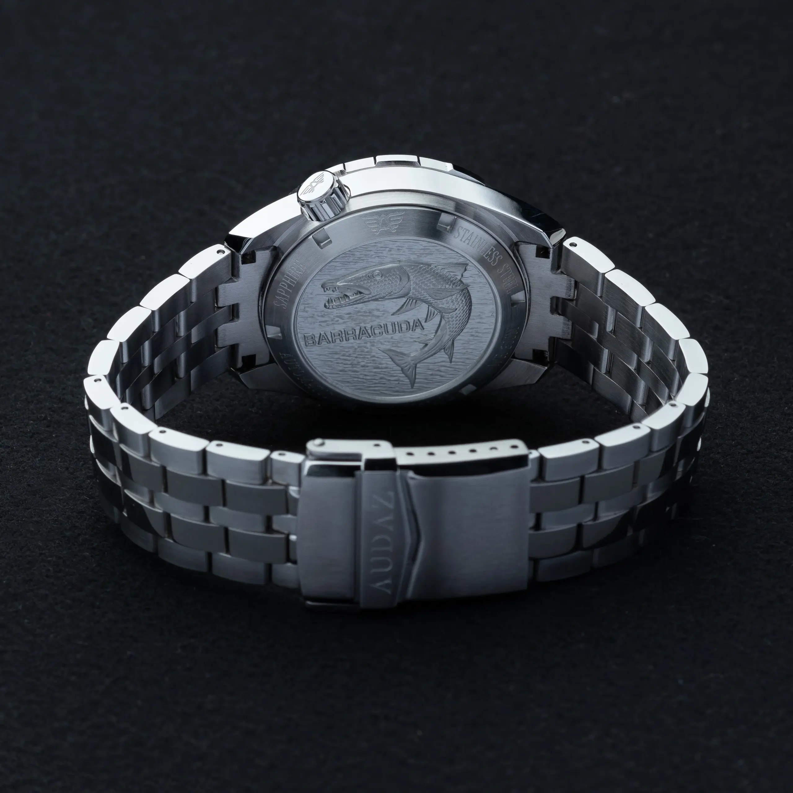The AUDAZ Barracuda is a performance-oriented Dive watche that is forged to combat the rigorous atmospheric pressures of the unknown seas. Constructed from 316L Stainless Steel material, the refined case and bracelet of the Barracuda watch is finished with elegant touches of shiny polish mixed with satin brush, delivering a sporty, stylish and dependable dive watch.Built for Ocean, The Barracuda Dive Watch emphasizes on clarity in design details. Maintaining the dive watch ethos, the Barracuda watch uses one of the brightest Grade C3 Super-LumiNova to enhance the legibility in low-light conditions. Besides the top grade lume, the watch is engineered for water resistance up-to 300m / 1000ft. Barracuda Watch features a unidirectional diver bezel complimented with premium quality ceramic insert, and a scratch resistant sapphire crystal ensuring complete functionality of the dive watch and elevating the owner’s wrist game at same time.The Barracuda watch comesin with a solid steel screw-in caseback, featuring a stunning motif of the Barracuda fish embossed spectacularly to echo the watch’s spirit. Barracuda dive watches are powered by 24-Jewel, well-engineered TMI-NH35 Automatic movements that are also popularly known as the workhorse automatic movement.
