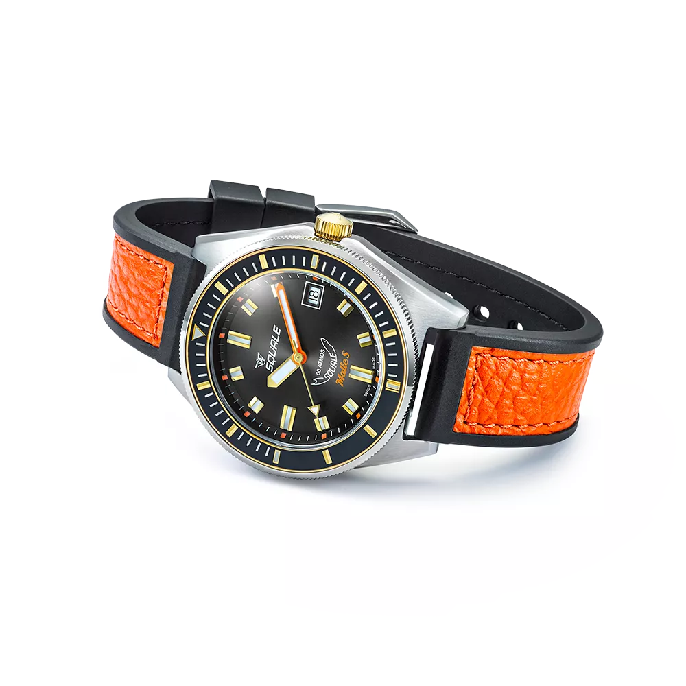 The great Swiss tradition of precision watchmaking, combined with a love of the sea and diving, were the two factors that led C. Von Büren to work exclusively on the construction of professional divers watches from the early ’50s. Initially, the “Squale” mark appeared on the cases of Swiss watches of various makes, as a sign of fine production and a quality symbol. Then, in the ’60s, Von Büren started to produce watches that also had the Squale mark on their dials, starting the brand?s institutional and commercial history. The first sporting successes, such as the world diving title won in Cuba in ’68, were linked to the names of products that had become as legendary as the medium, Master 50 atm. The ’70s saw the birth of the first “1000 meter” watch with glass on flexible mounting and snap-on lunette which could be turned in both directions. Squale continued to produce for other brands and started to supply the elite corps of a large number of armed forces, including the parachutists of Italy’s Folgore Brigade and the Italian Navy’s Diving Corps. All this has made Squale synonymous with quality and the benchmark brand for divers’ watches internationally, a status it has enjoyed for several decades.