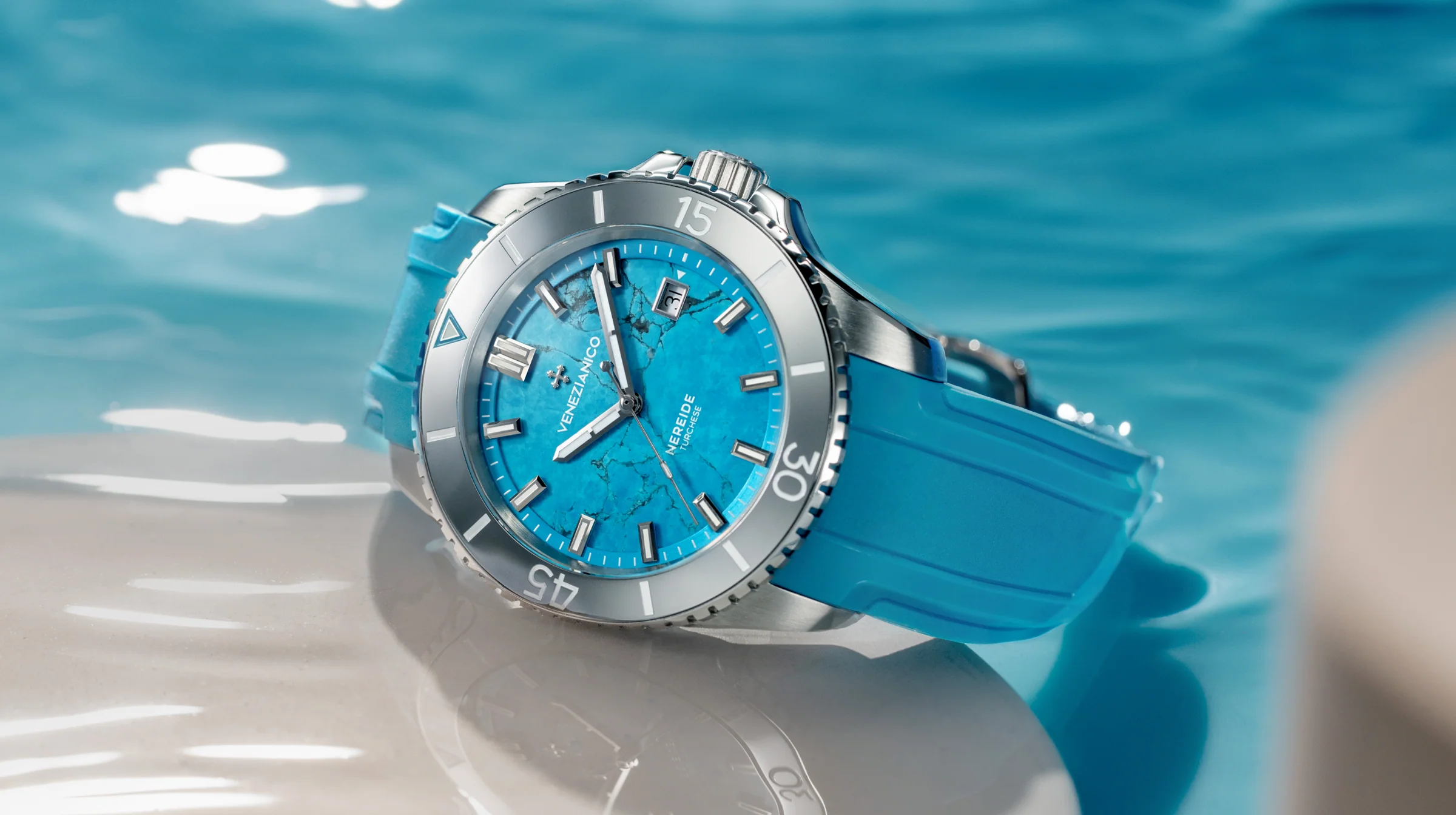 The Nereide Turchese captures the vibrant hues of turquoise, a gemstone celebrated for centuries for its natural beauty, symbolic meaning, and connection to the elements. Each dial, with its unique veins and luminous surface, evokes the bright, ever-changing tones of the Venetian lagoon, making every watch one of a kind. Crafted with meticulous care through cold-cutting and fine polishing, the dial preserves the stone’s integrity while highlighting its natural expressiveness. The light blue strap complements the dial’s shades, reinforcing the watch’s maritime inspiration. Engraved at the center of the caseback, the Nereide submarine in motion honors the collection’s heritage and underwater performance. With 200-meter water resistance and a rotating bezel, this watch combines artisanal elegance with uncompromising technical functionality.