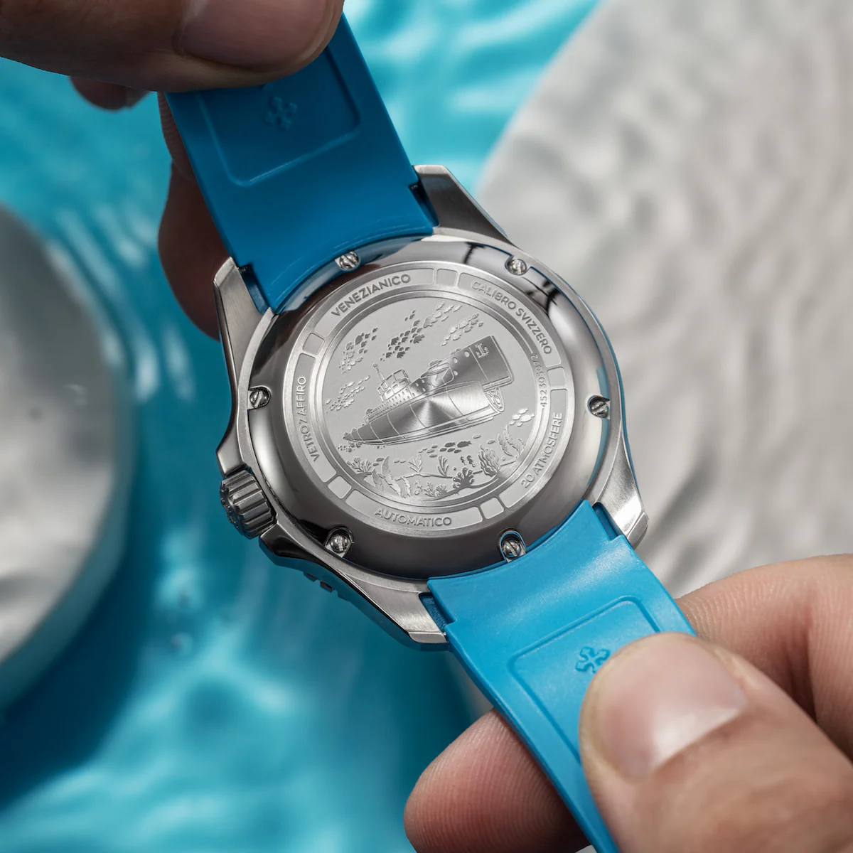 The Nereide Turchese captures the vibrant hues of turquoise, a gemstone celebrated for centuries for its natural beauty, symbolic meaning, and connection to the elements. Each dial, with its unique veins and luminous surface, evokes the bright, ever-changing tones of the Venetian lagoon, making every watch one of a kind. Crafted with meticulous care through cold-cutting and fine polishing, the dial preserves the stone’s integrity while highlighting its natural expressiveness. The light blue strap complements the dial’s shades, reinforcing the watch’s maritime inspiration. Engraved at the center of the caseback, the Nereide submarine in motion honors the collection’s heritage and underwater performance. With 200-meter water resistance and a rotating bezel, this watch combines artisanal elegance with uncompromising technical functionality.